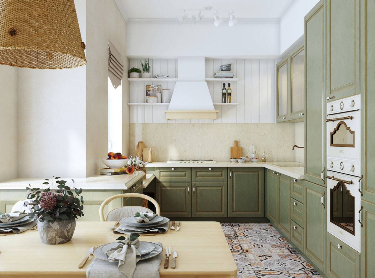 В стиле прованс будет уместен деревянный гарнитур, стол и стулья мятного, оливкового или светло-зеленого цвета. Основная отделка комнаты выполняется в бежевых или песочных тонах, создающих на кухне уютную атмосферу.