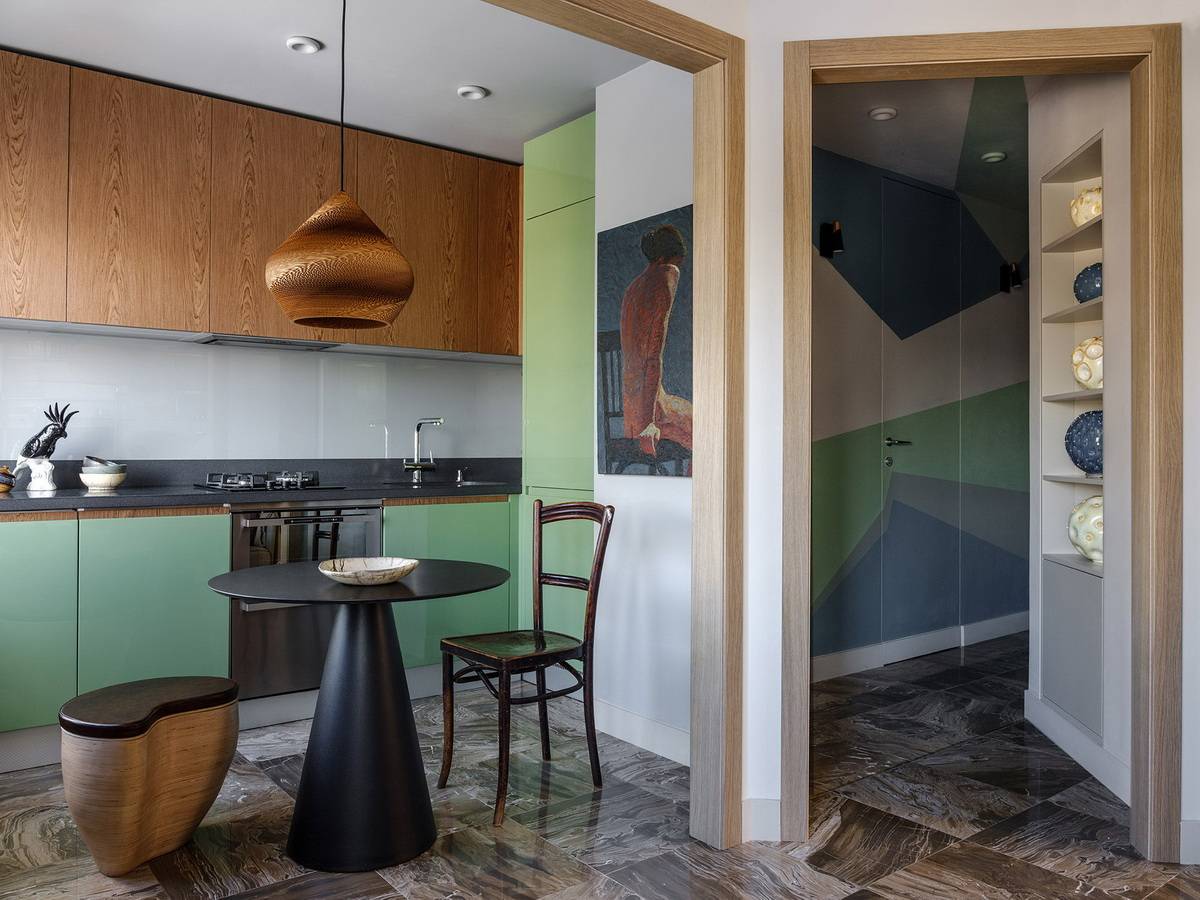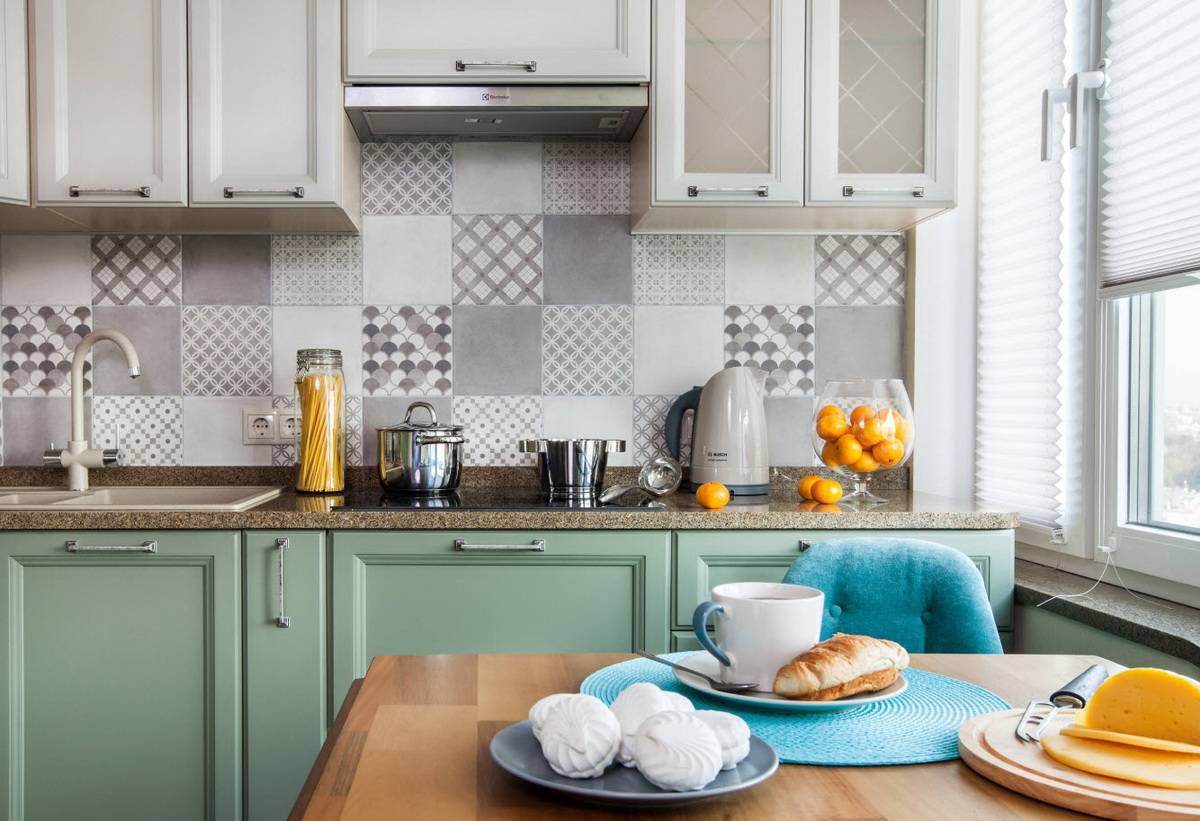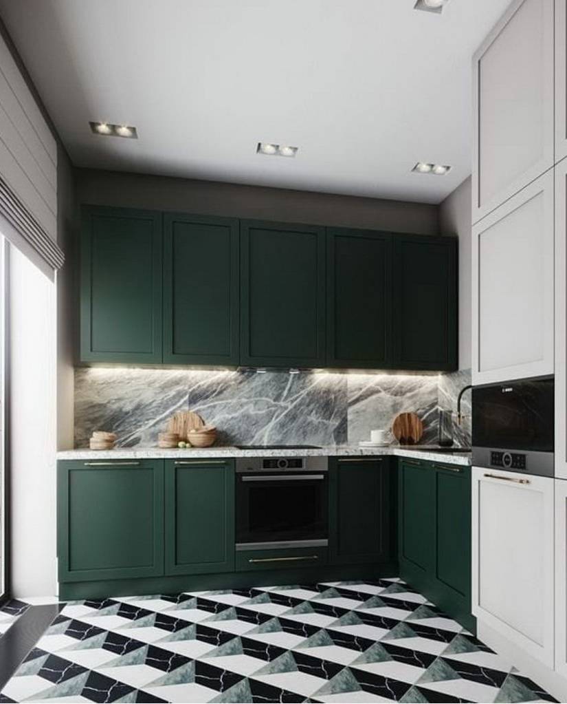 В первую очередь обратите внимание на естественное освещение. Если окна выходят на южную сторону и на кухне много солнечного света, то можно использовать более холодные оттенки зеленого