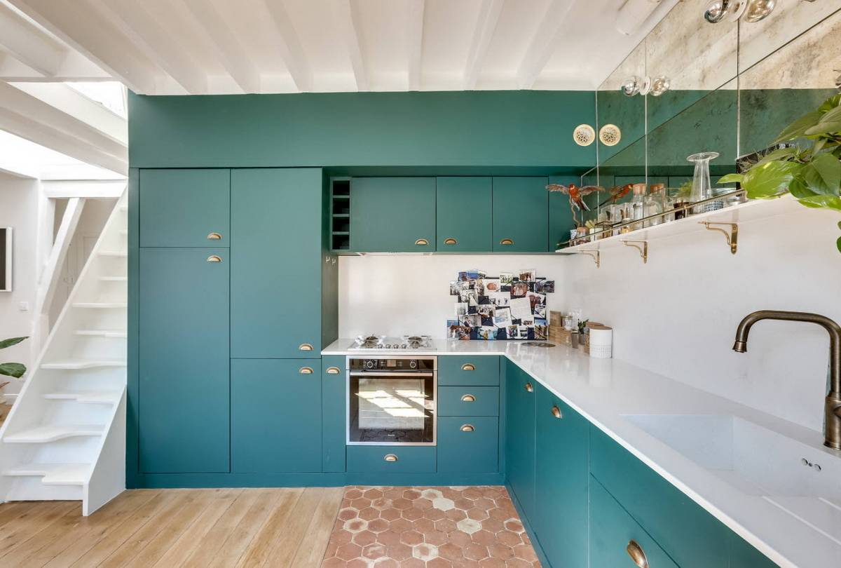 Оригинальная изумрудная кухня может красиво сочетаться с рядом цветов и фактур: