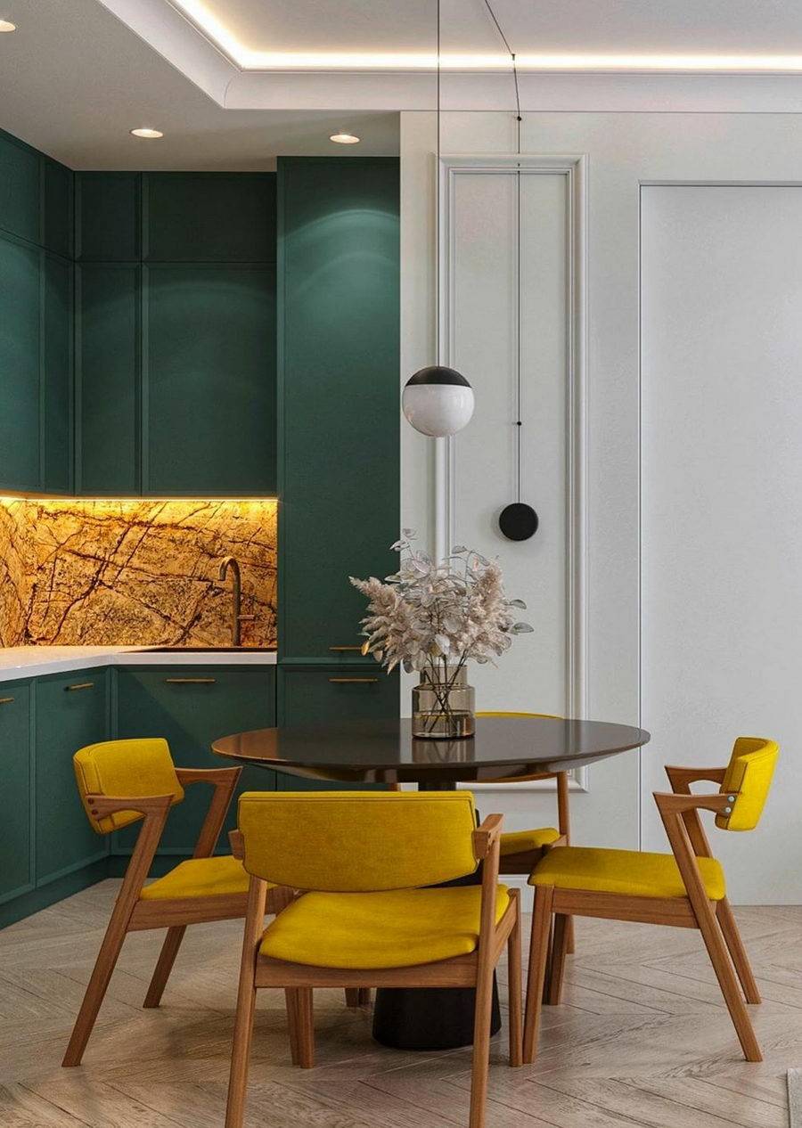Сочный зеленый в сочетании с такой же насыщенной обеденной поверхностью приведет в восторг всех членов семьи.