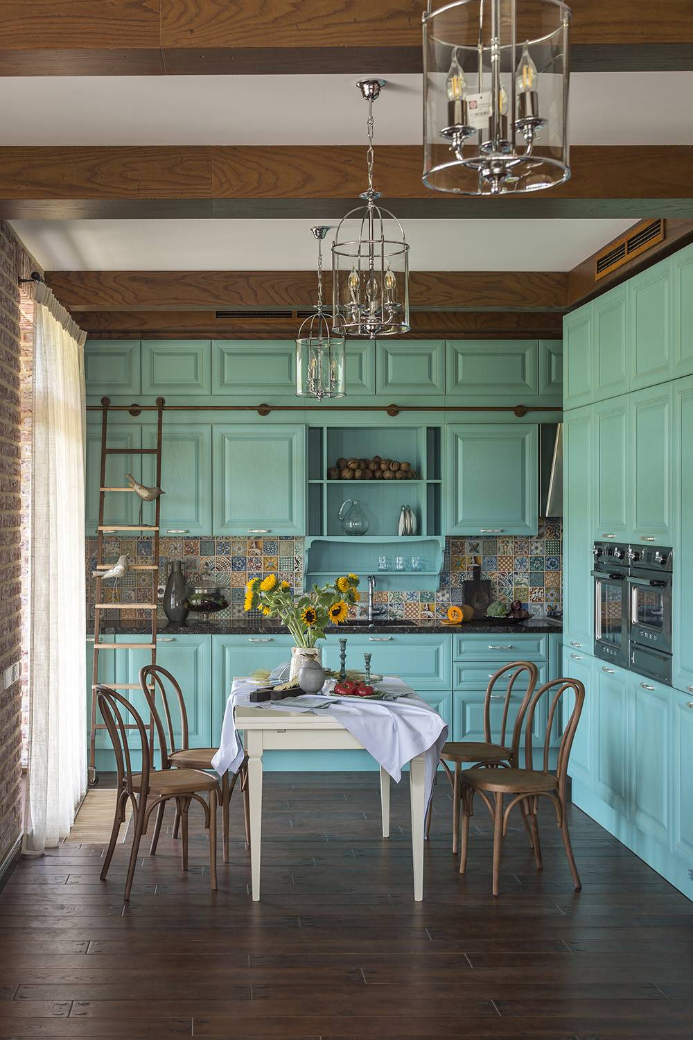 Изумрудно-синяя отделка кухни создаст иллюзию прохлады в помещении. Лучше всего эту особенность стоит применить для южной комнаты. Размещение зеленого ковра создаст эффект лужайки. Смешение в интерьере синего и изумрудного добавит кухне зрительной глубины.