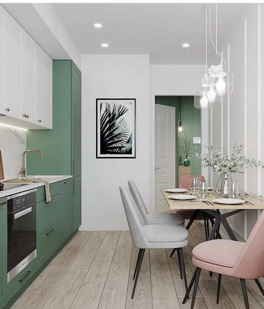 Кухня фисташкового цвета или более холодного мятного в сочетании с белыми стенами и включениями розового выглядит свежо и нежно.