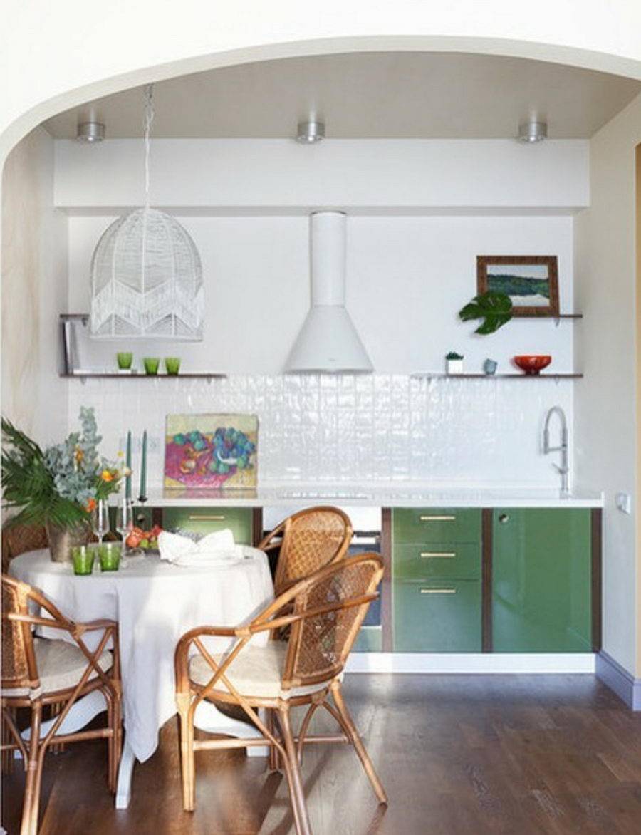 Здесь кухонный гарнитур может быть выполнен в достаточно ярко-изумрудном и даже лимонном цвете. Оформление остальной части помещения использует чаще всего светлые материалы. Но обеденные стулья и стол предпочтительны в натуральном древесном оттенке.