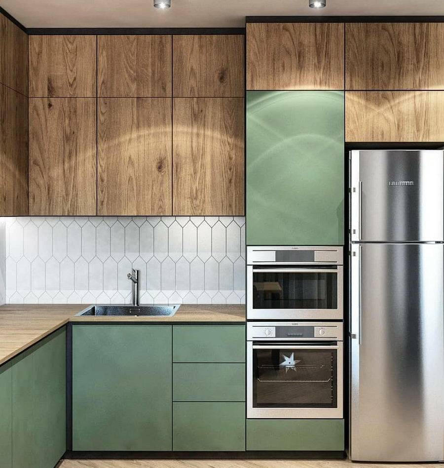 Еще одно классическое сочетание – это зеленый и коричневый или бежевый цвета, которые могут быть представлены в виде деревянной мебели, кирпичной стены, плитки на полу и фартуке и т.д.