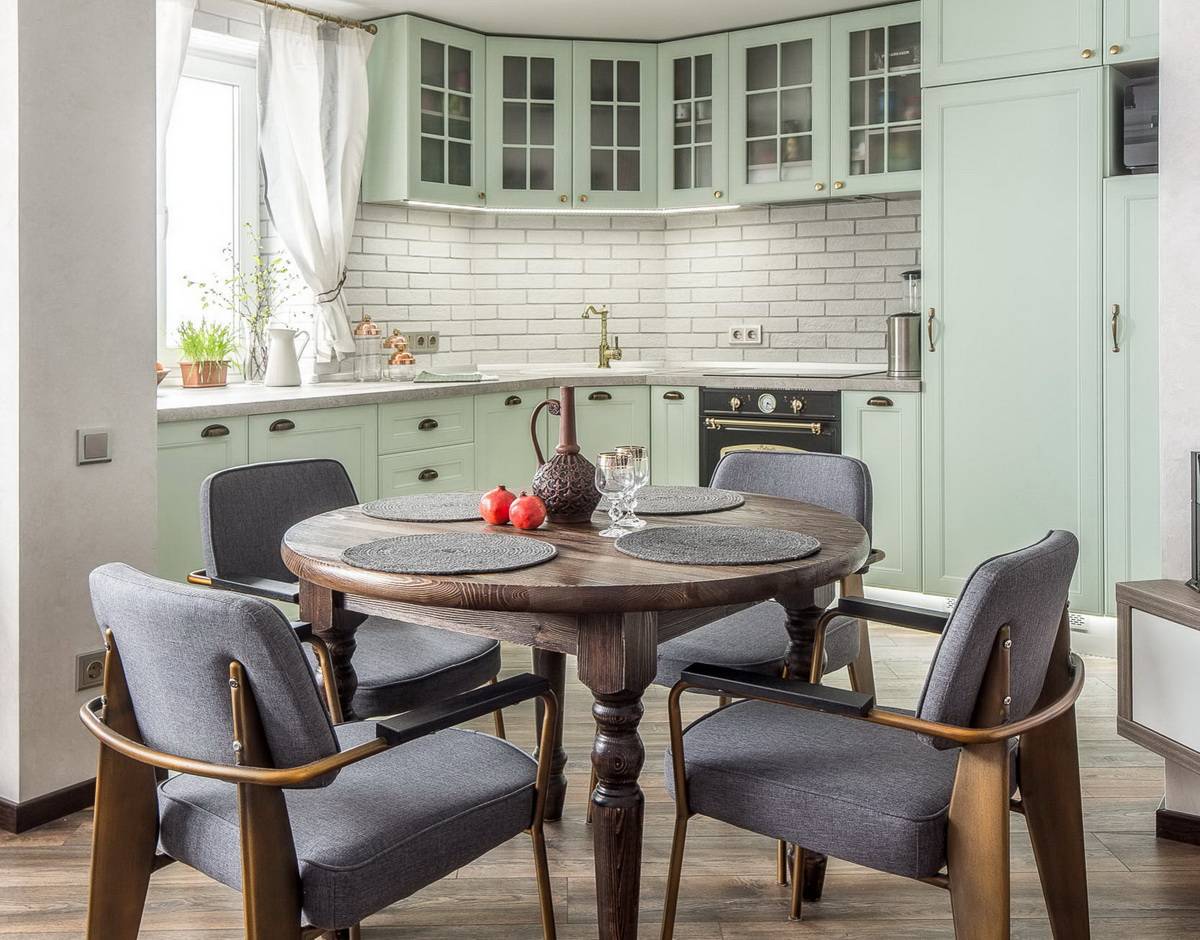 Возможные варианты дизайна обеденной зоны с зеленым кухонным гарнитуром: