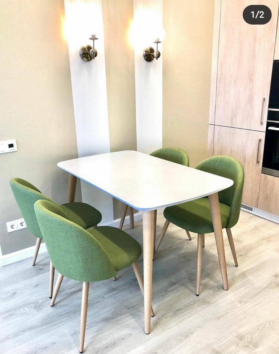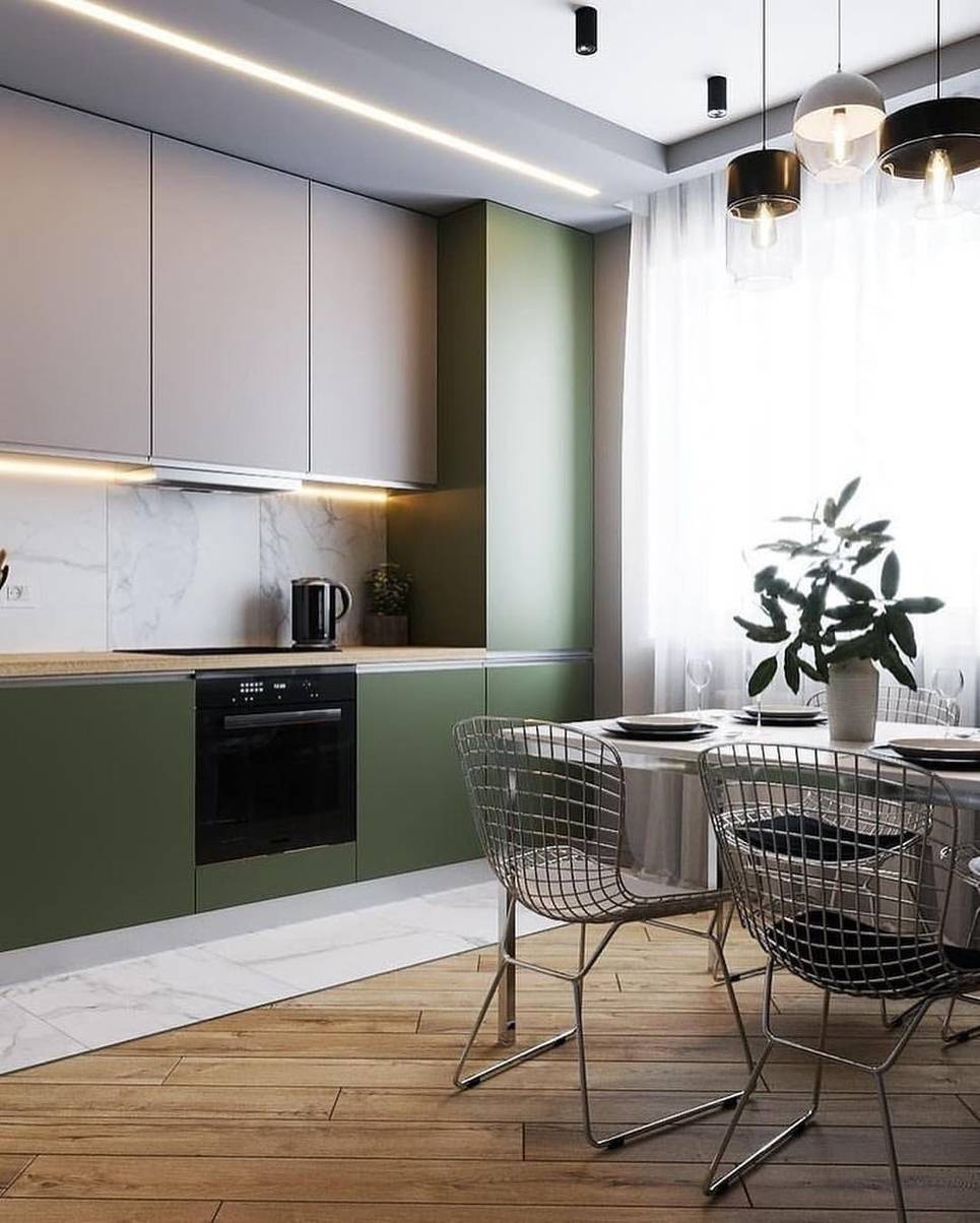 К зеленому кухонному гарнитуру можно подбирать обеденную зону в той цветовой гамме, которая гармонирует с выбранным оттенком фасадов (см. пункт выше «Модные оттенки и сочетания цветов»).