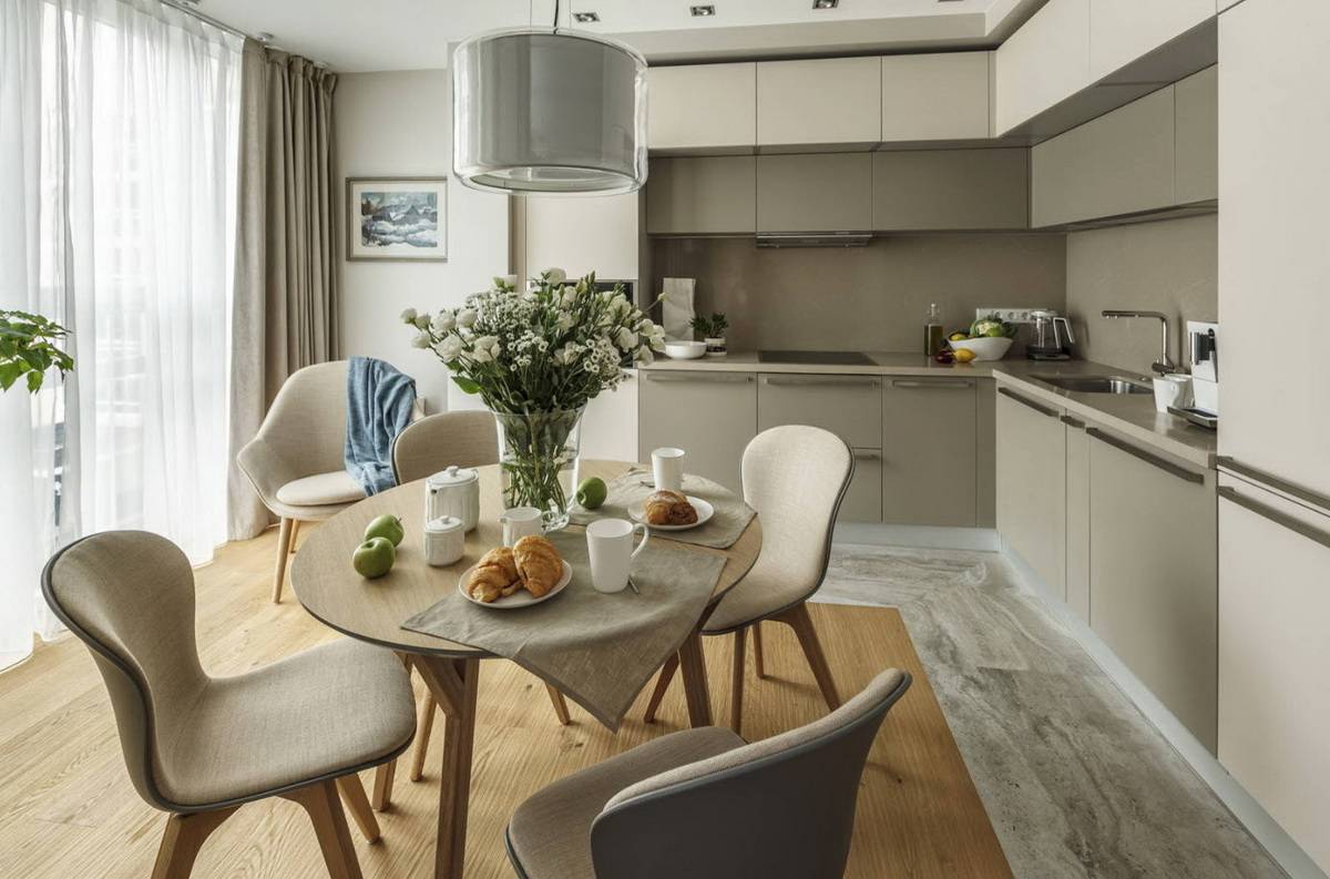 Оптимально выдерживать нейтральный тон во всем: шторы, скатерть, занавески на полках – все это лучше выполнить из льна, в тот же цвет следует окрасить стены. Или же для стен выбирают фисташковый оттенок, тогда гарнитур будет нейтрально молочным, кремовым или бежевым.