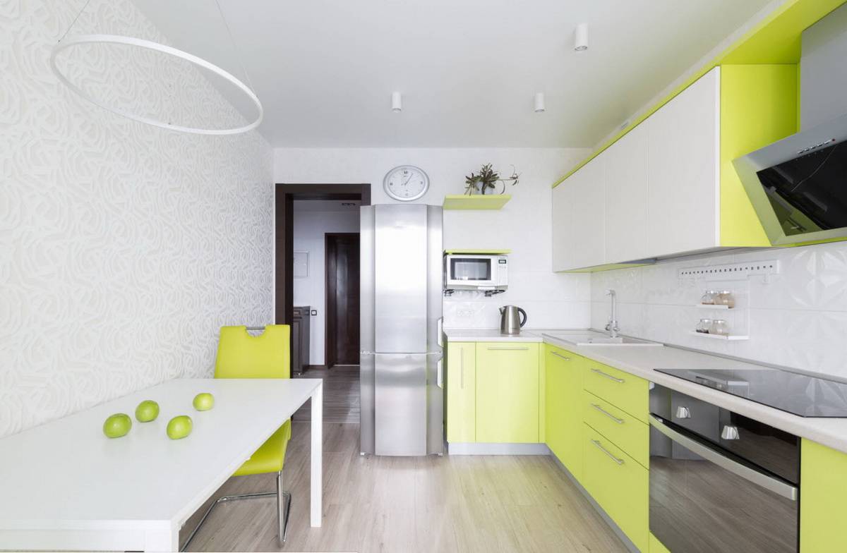Кухня в зеленом цвете почти кислотного оттенка, пожалуй, сочетается только с белым фоном.