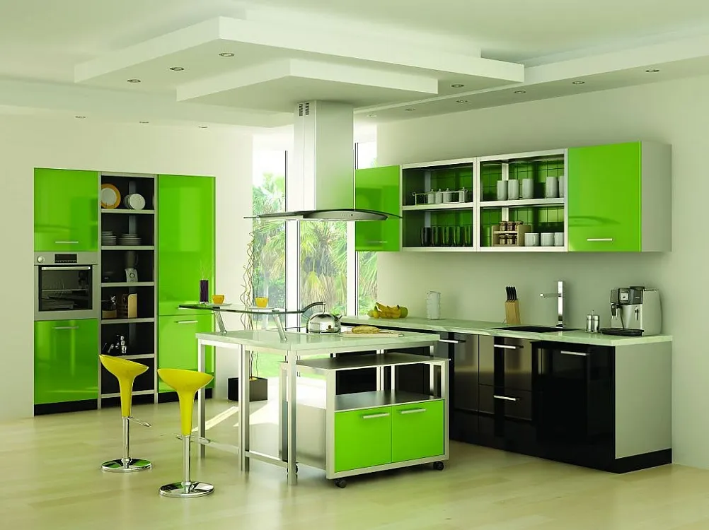 Еще один яркий и жизнеутверждающий оттенок. Он ассоциируется с весной, жизнью и молодостью. Кухня с салатовым гарнитуром получается красочной и сочной, она словно наполняется светом.