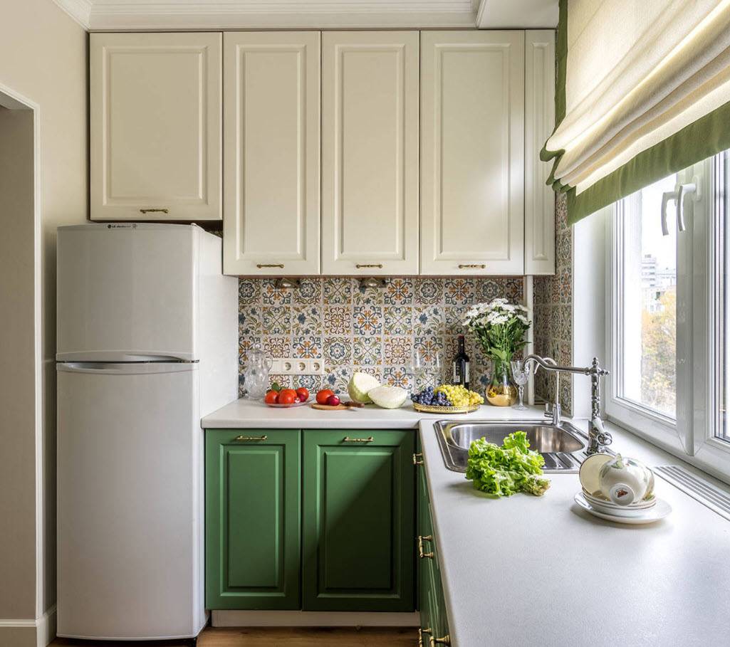 - Если зеленым выполнен основной интерьер, то гарнитур может быть в любом нейтральном цвете, а фартук – из яркой, блестящей плитки или с узором.