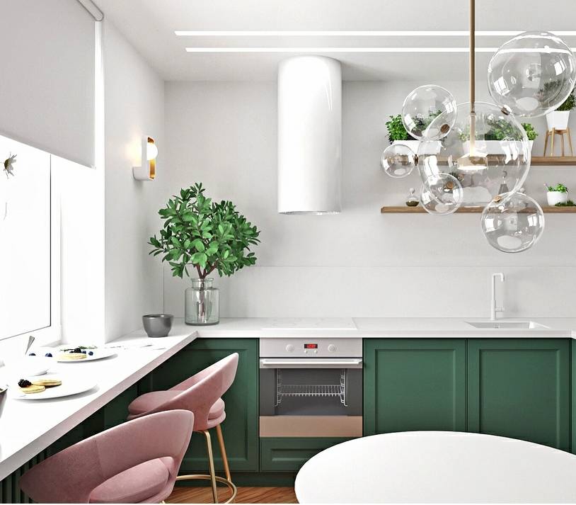 Бело-зеленая кухня — это самое классическое и гармоничное сочетание. К этому дуэту вы можете добавить любые цветовые акценты и не сильно беспокоиться по поводу пропорций.