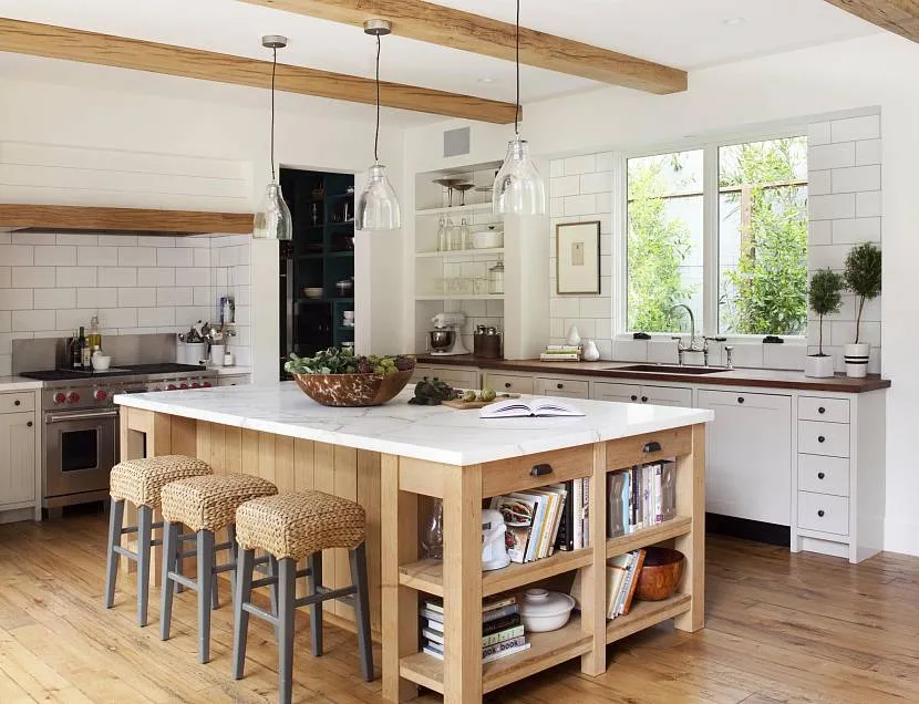Излюбленным материалом американских кухонь является древесина. Её стараются использовать по максимуму: деревянные фасады с лаконичной филёнкой, добротная деревянная мебель и пол. В старых домах в интерьере обязательно оставляют балки и деревянные панели на стенах, реставрируют старые оконные рамы. Стены обычно красят или штукатурят, обои встретишь не часто.