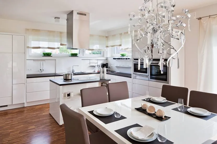 Второй тип кухонь чаще встречается в городах. Базовым цветом выбирают белый, поэтому интерьер выглядит ярко, рафинированно. Здесь чаще используют цветовые акценты и контрастные сочетания. Например, в белоснежной кухне столешница может быть чёрной, темно-синей или темно-коричневой; контрастным часто делают и пол.