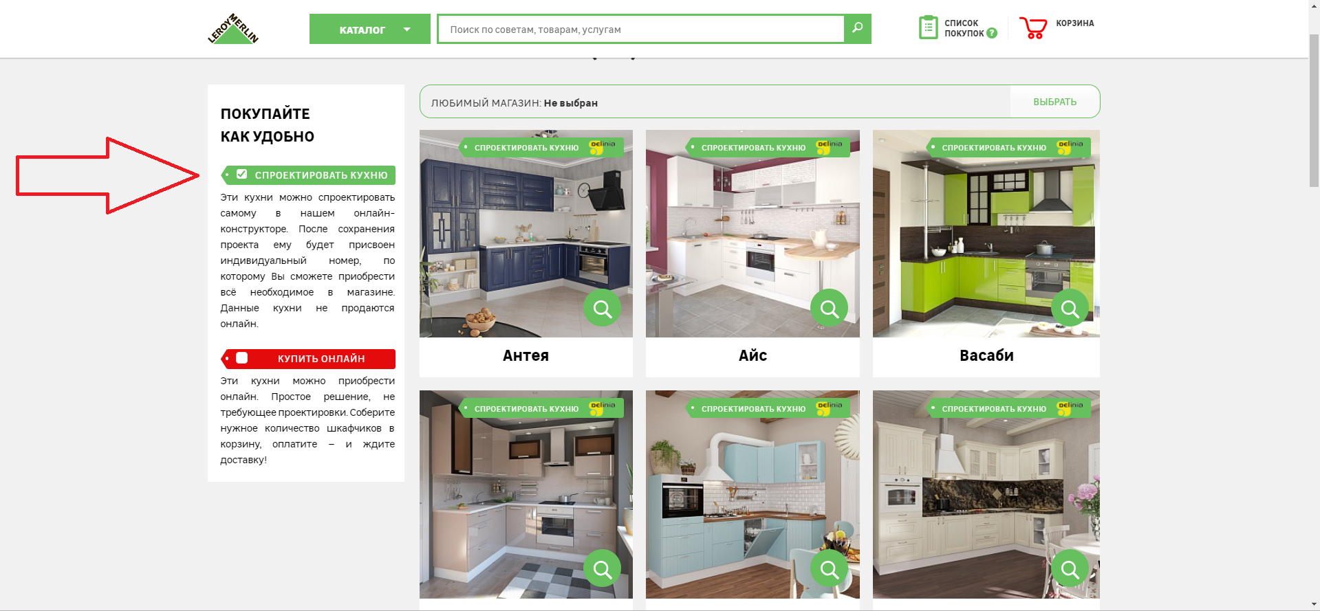 - Леруа Мерлен ‑ https://leroymerlin.ru/catalogue/proekt-kuhni/?ekitchen=1.