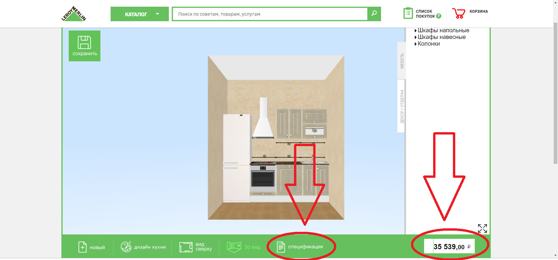 Спецификация со списком товаров в Леруа МерленСпецификация со списком товаров и размерами модулей в планировщике ИКЕА