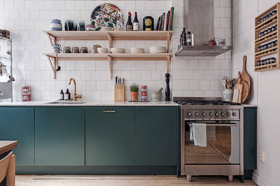 Зелёный цвет может быть каким угодно: всех оттенков бутылочного стекла, грязно-зелёным, приглушенно-оливковым или неярко-травяным. Он хорошо сочетается с чёрным мрамором и темным дубом. Старинные кухни – раздолье для всех оттенков коричневого.