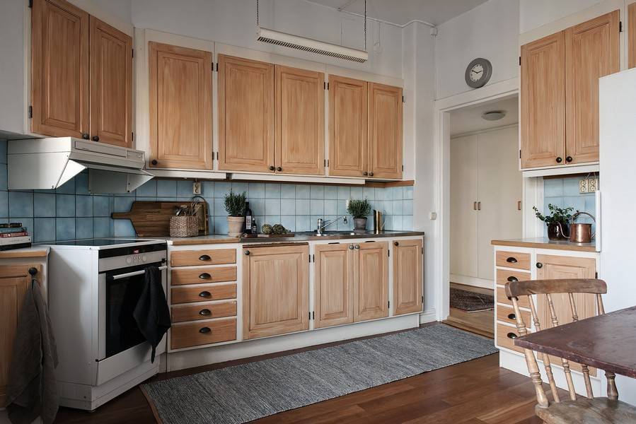 Кухонную мебель из массива натурального дерева покрывают лаком или окрашивают в подходящий цвет, сохраняя фактуру дуба, ольхи или сосны. Хорошо смотрится зеленая мебель в этом стиле. Если не можете решиться на такой выбор, используйте керамическую плитку зелёного цвета для фартука, рейлинги под старину или повесьте шторы в сине-зелёной гамме.