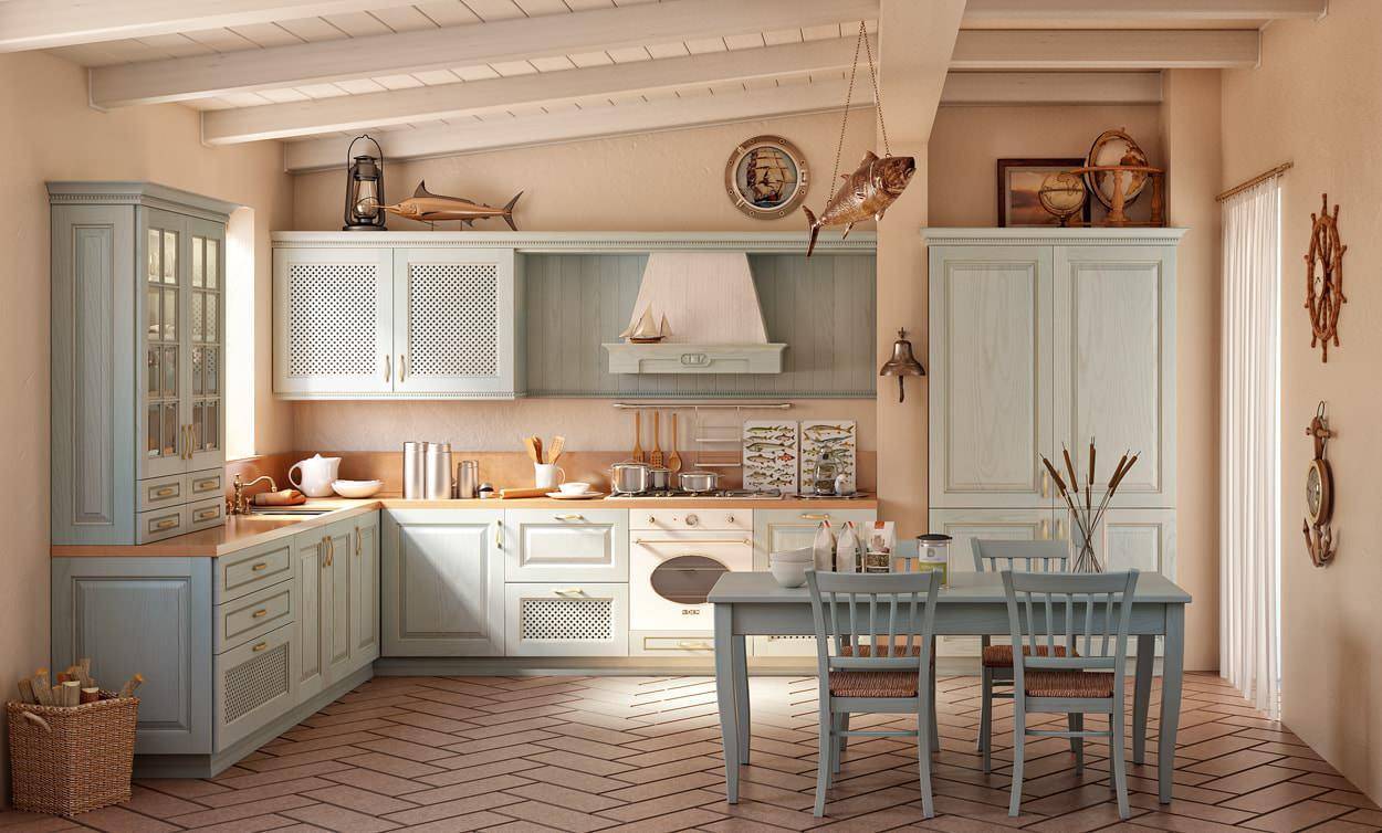 Кухонную мебель из массива натурального дерева покрывают лаком или окрашивают в подходящий цвет, сохраняя фактуру дуба, ольхи или сосны. Хорошо смотрится зеленая мебель в этом стиле. Если не можете решиться на такой выбор, используйте керамическую плитку зелёного цвета для фартука, рейлинги под старину или повесьте шторы в сине-зелёной гамме.