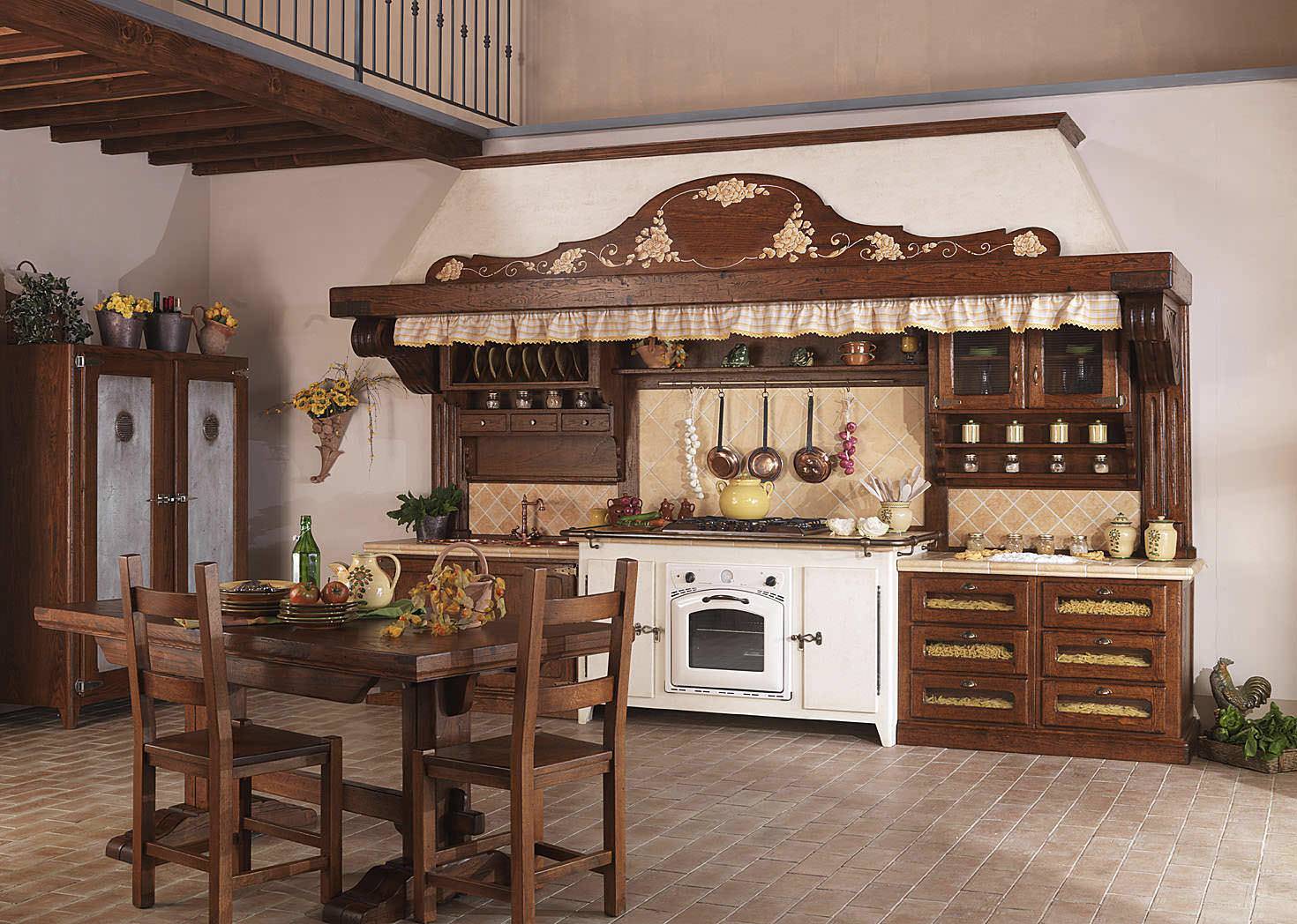 Обратите внимание на гарнитуры из благородного дуба или более демократичной сосны. Производители выпускают мебель, которая хорошо вписывается в интерьер кухни, оформленной под старину