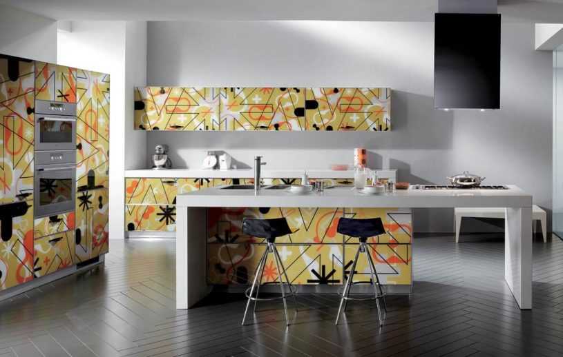 Стоит применять изображения на предметах мебели, а одной месте, это качается в первую очередь объемных рисунков. Таким образом, вы сбалансировано украсите кухонную комнату, сделаете ее свежее, более обновленной и стильной.