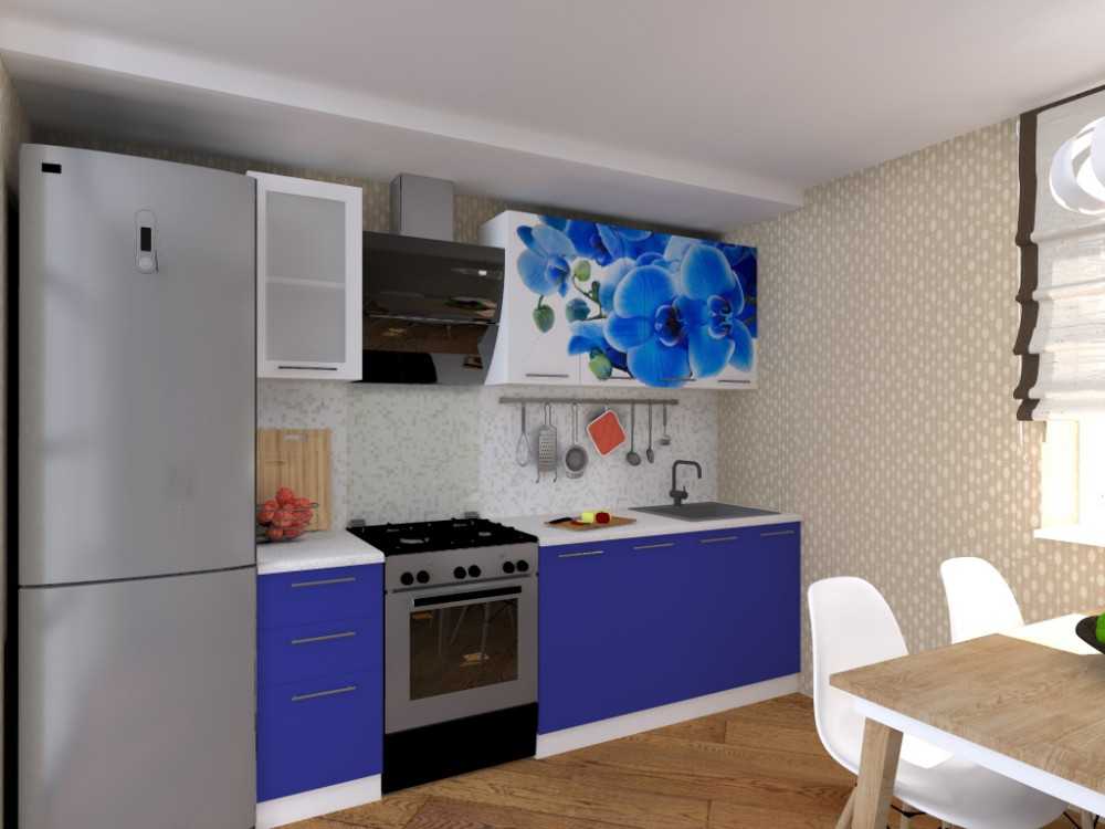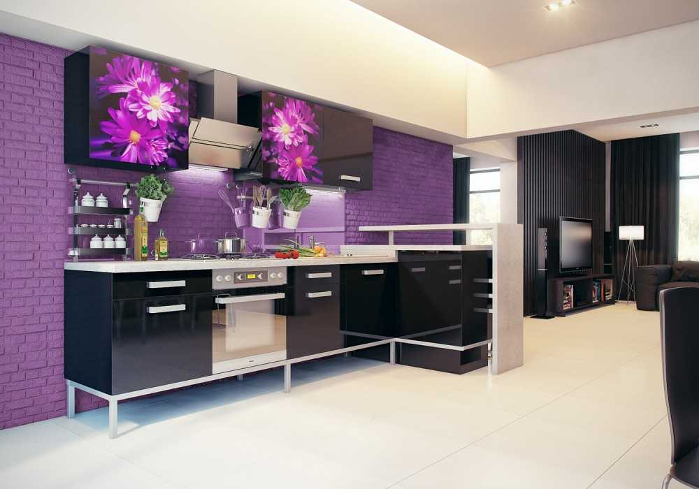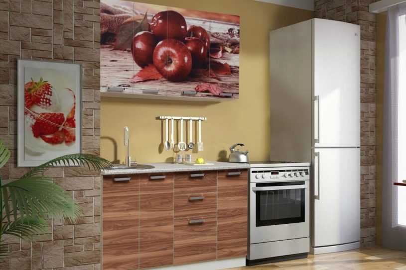 На фото кухни с фотопечатью видно, как меняется внешняя обстановка фасада. Несмотря на размер помещения, фотообои служат прекрасным способом разнообразить, внести яркость и особенную атмосферу в кухню.