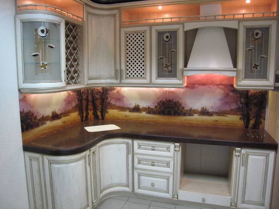 Выше уже описывалось, что для этой цели используется каленое стекло толщиной от 6 до 12 мм. Изображение наносится на одну из сторон, которая и крепится плотно к стене. Таким образом вы можете не переживать, что горячий пар или жир испортят рисунок. А стекло выдержит повышенную температуру и влажность, которые царят на кухне во время “ритуальных танцев у костра”. По этой же методике можно преобразить кухонные фасады, вставив стекло в рамку.