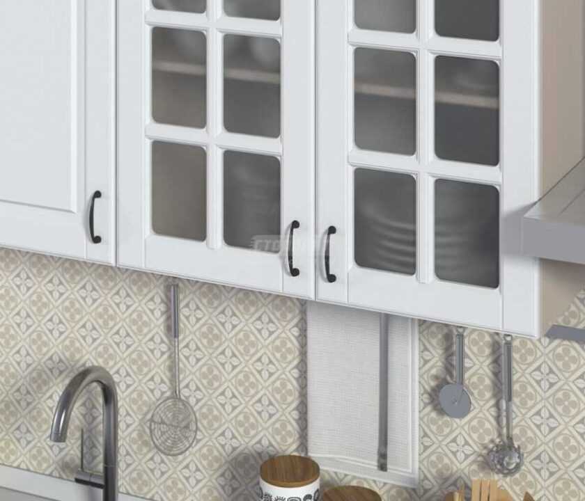 Гарнитур выполнен в светлых тонах от полностью белого до цвета слоновой кости. Изящная фрезеровка по фасаду в виде сеточки придает этому гарнитуру особую изысканность. Она дополняется вставками в дверцы из матового, белого стекла.