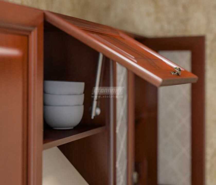 Мебельная компания Столплит выпускает для кухни Регина фасады МДФ с фрезеровкой и без нее. Но размеры дверок могут быть разными: для высоких элементов или низких. Модульные шкафы имеют полностью глухие фасады, частично открытые верхние полки, стеклянные элементы.