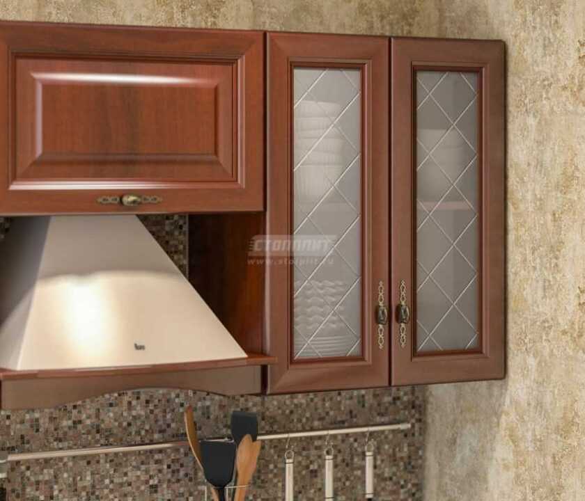 Все фасады выполнены из МДФ с дополнительным покрытием. Они отделаны качественной фрезеровкой, деревянными решетками и имеют вставки из матового стекла.
