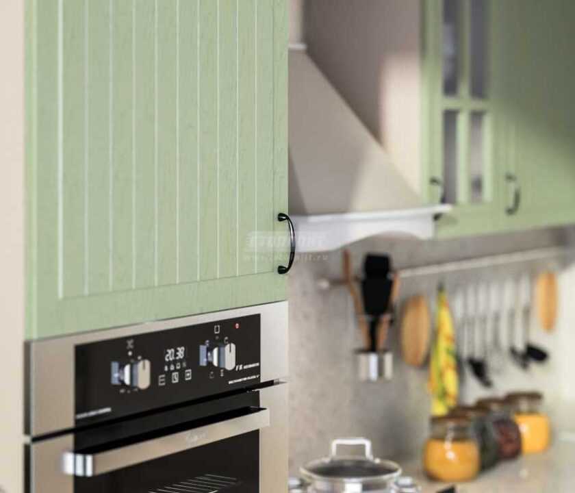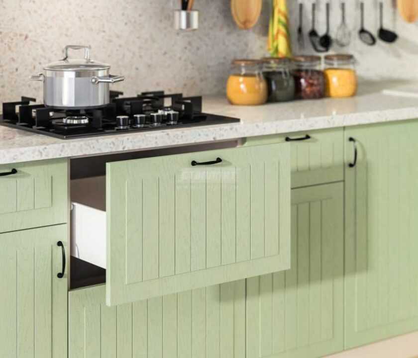 Фасады украшены “ступенчатой” фрезеровкой. Такие фасады точно понравятся хозяйкам, которые предпочитают классические решения на кухне