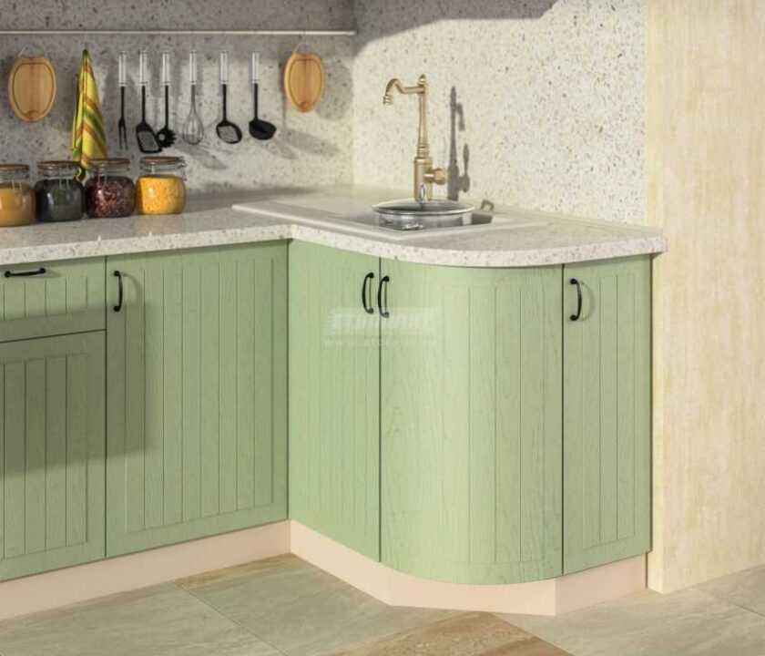 Шкафы могут быть открытыми или закрытыми. Есть возможность обыграть острые углы, используя как верхние, так и нижние торцевые полки. Они представляют собой открытые закругленные шкафы, на которых можно разместить разные кухонные принадлежности.