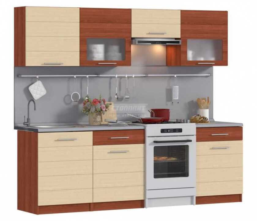 Остальные гарнитуры выполнены в стиле модерн, что позволяет выбрать кухню с оригинальным дизайном. Например, фасады кухни Милена выполнены из МДФ и предлагаются в двух видах расцветки. Первый вариант — это сочетание вишня/клен, второй вариант представлен более современным сочетанием дуб феррара/онденс.