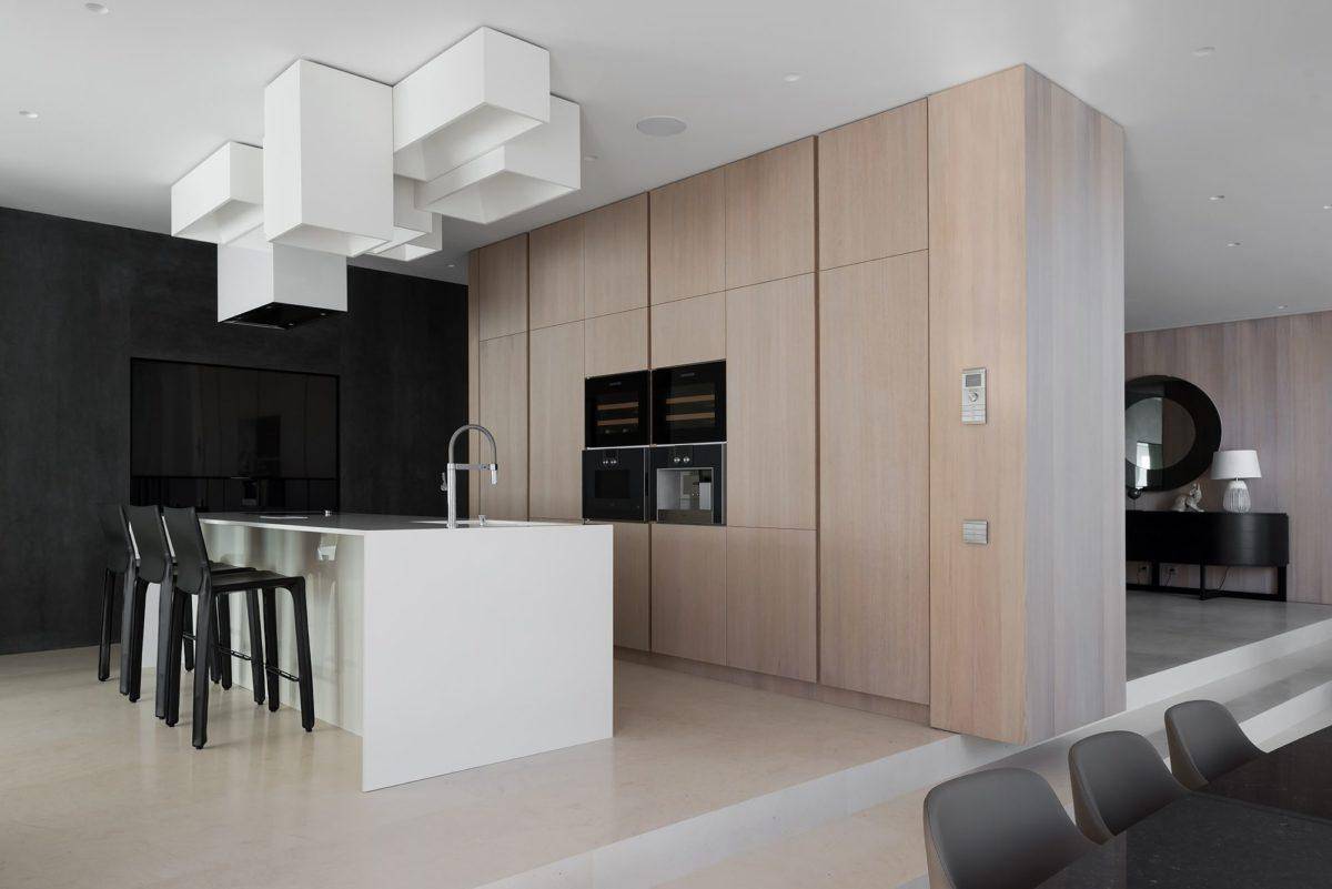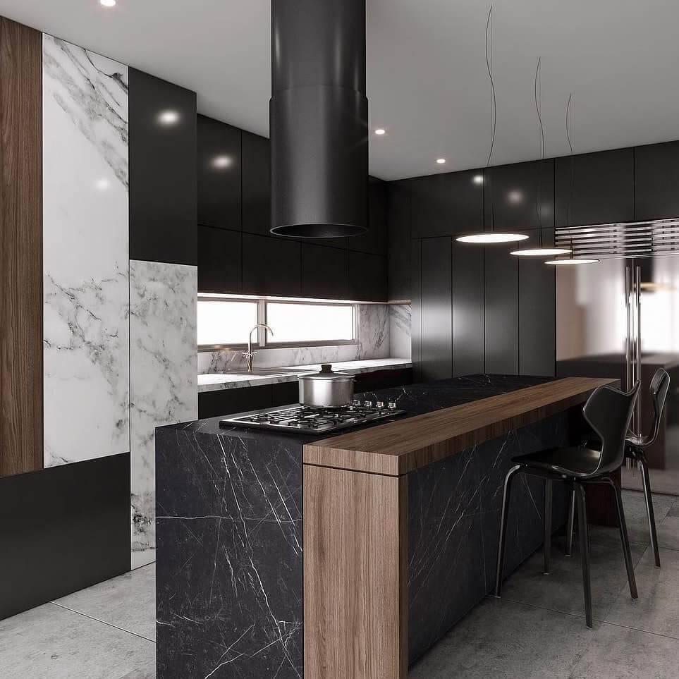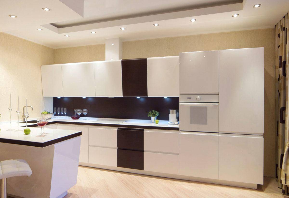 Зачастую вместе с потолком устанавливают встраиваемую подсветку, которая находится на границе черных и белых панелей. Такой потолок разделит пространство на рабочую и обеденную зоны. Разбавит черно-белую конструкцию яркий кухонный фартук или лаконичный декор.