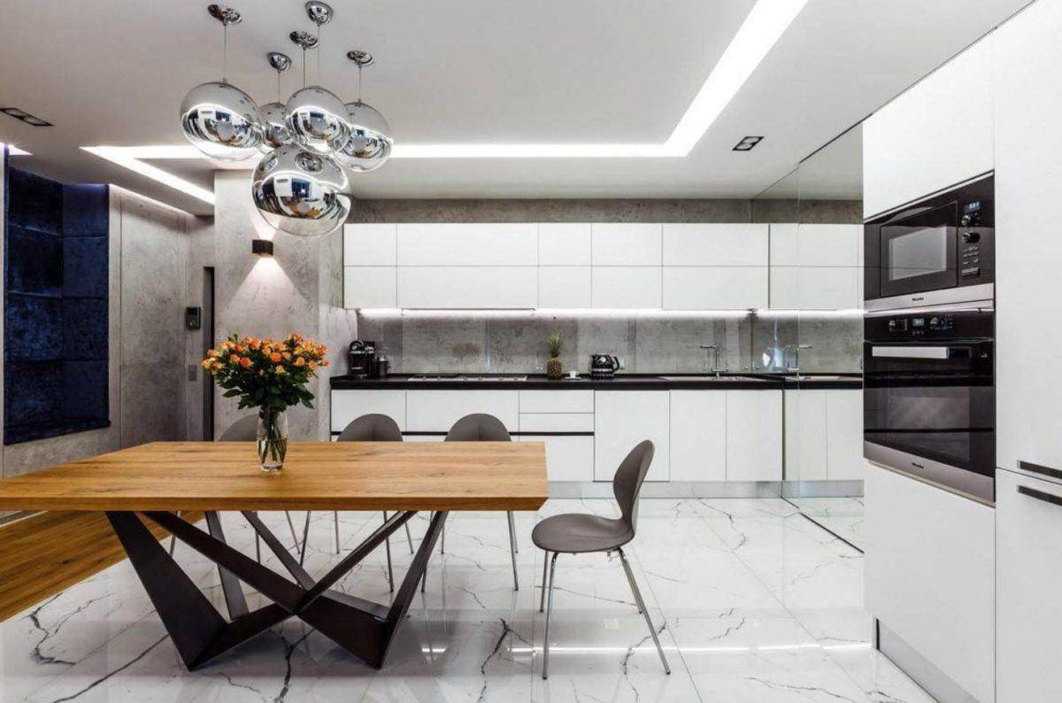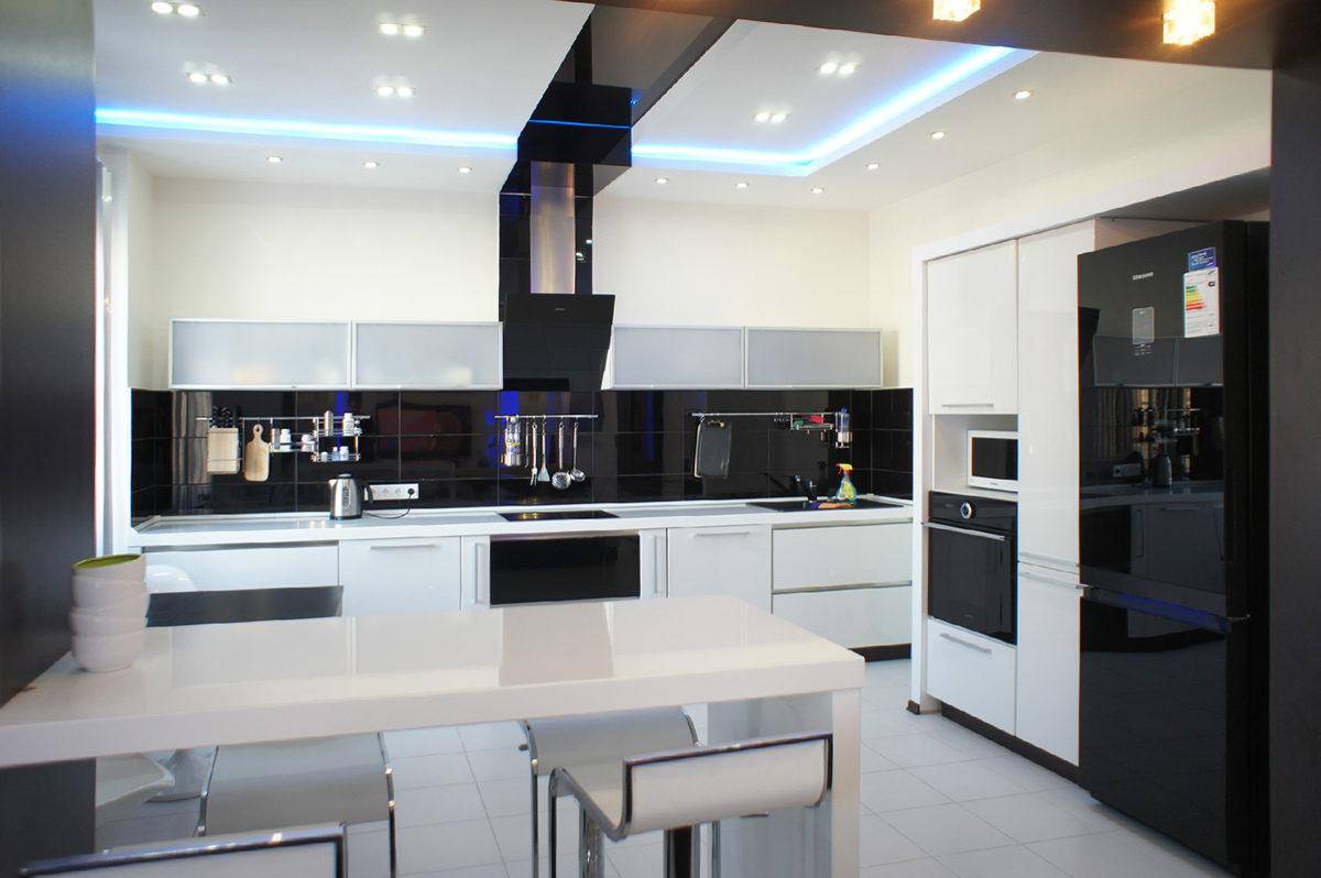 Потолок лучше сделать натяжным: глянцевая поверхность даст больше света и будет идеально отражать современное оборудование кухни. Отличным дополнением станет светодиодная подсветка в неоновой гамме, а для расстановки акцентов подойдут точечные приборы освещения.