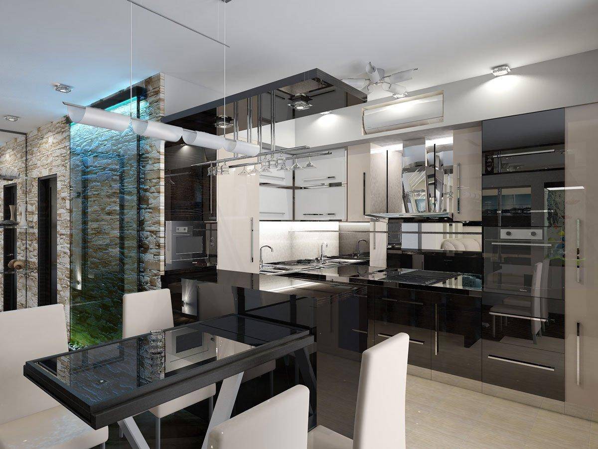 Кухонный гарнитурФартучный дизайн кухни придает помещению строгий и минималистичный вид. Здесь отсутствуют всевозможные рейлинги и полки, куда помещается кухонная утварь Заказывать фасад лучше под тон стен. Встроенная кухня визуально увеличивает помещение.Оформляя интерьер кухни лучше применить гарнитур, фасад которого изготовлен из пластика или обладает стеклянными/зеркальными вставками. Приветствуется наличие нескольких полок с навесными шкафами. Рабочую поверхность не стоит засорять кухонными предметами. Это место лучше оставить пустым. Здесь можно поместить красивые вазочки, статуэтки, декоративные штучки.Обеденная зонаЗадействовать каждое место на кухне можно при помощи потайных выдвижных шкафчиков и многоярусных скрытых полок.Устанавливая рабочую поверхность лучше выбрать искусственный или натуральный камень. Можно дать предпочтение прочному закаленному стеклу