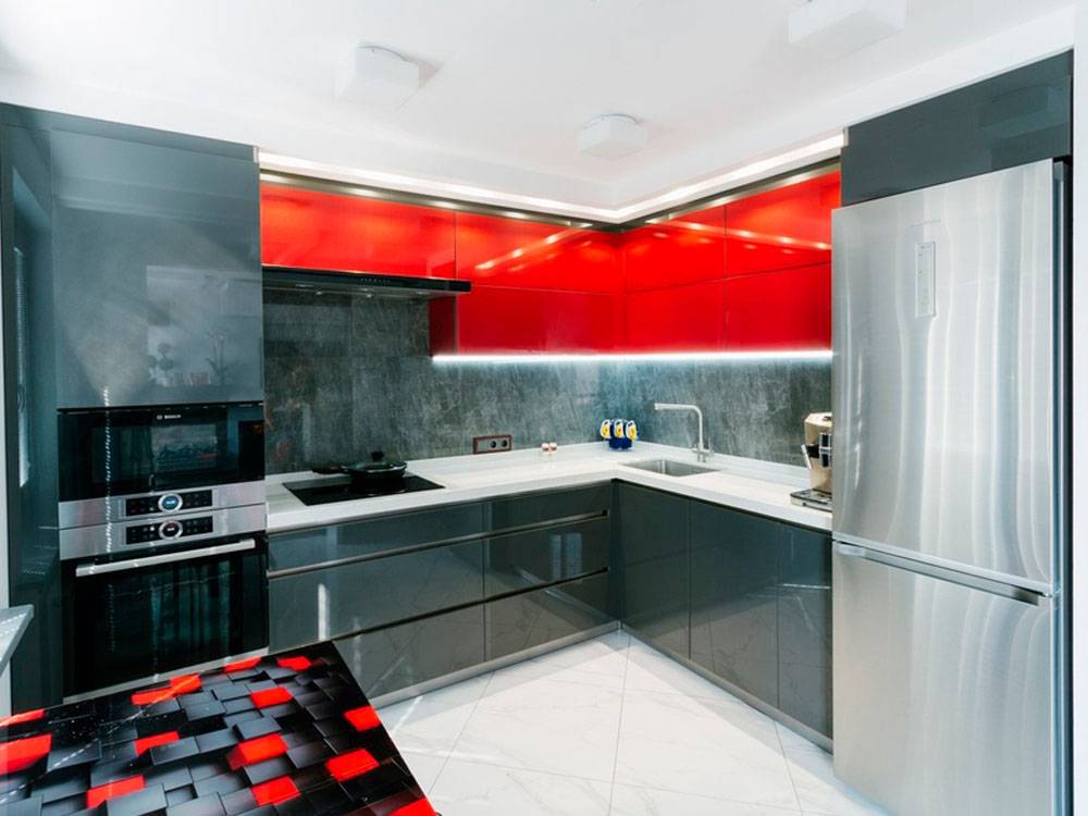Зеркальные отражения и металлический блеск – это то, что присуще стилю, но все эти нюансы важно грамотно распределить, чтобы не превратить кухню в аквариум. Потолок лучше сделать натяжным: глянцевая поверхность даст больше света и будет идеально отражать современное оборудование кухни. Отличным дополнением станет светодиодная подсветка в неоновой гамме, а для расстановки акцентов подойдут точечные приборы освещения