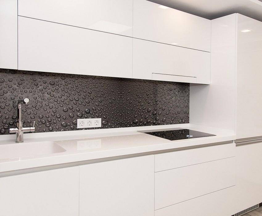 Фартук делают из плиток или накладных глянцевых панелей. Он должен быть однотонным, без рисунков и принтов.