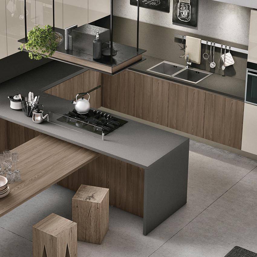 Столешница и фартук должны соответствовать общему стилевому решению. Материалы столешницы используют разные: натуральный камень или его имитация, МДФ.