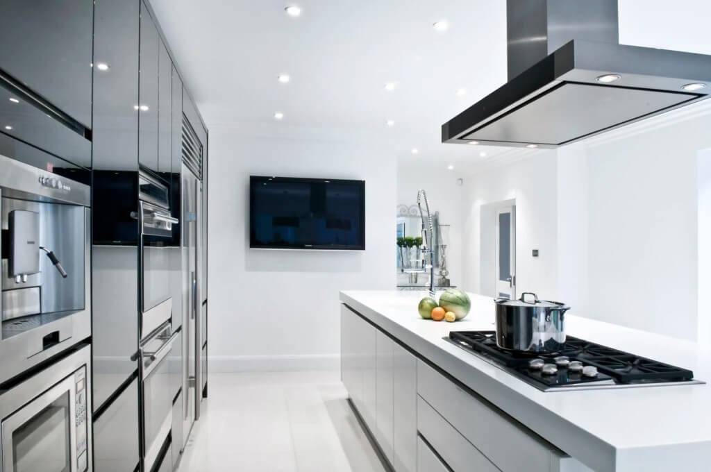 Кухню хай-тек белого цвета лучше не разбавлять большим количеством дополнительных деталей