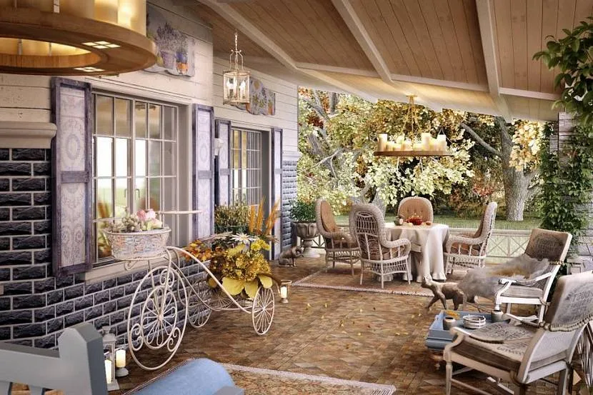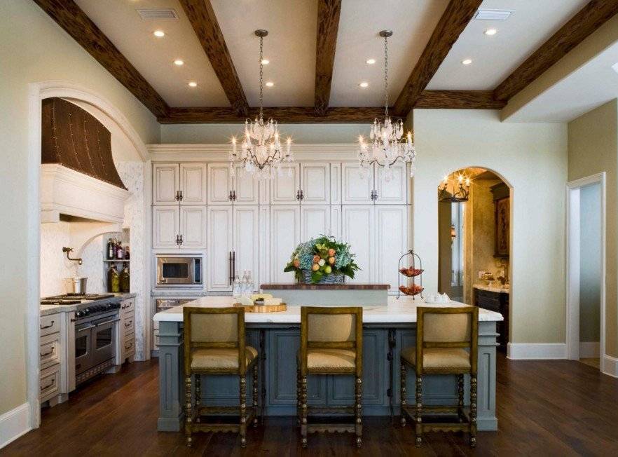 Стены должны иметь гладкую структуру. С этой целью их белят, красят водоэмульсионной краской или обшивают обработанной доской. Оригинально будут выглядеть вставки из плитки или камня. Для воссоздания идеальной картины сельских мотивов потолок украшается деревянными балками. Наличие современных пластиковых панелей или винила может испортить эффект. В виде напольного покрытия можно использовать паркетную доску, ламинат, крупную плитку из искусственного камня с матовой поверхностью.