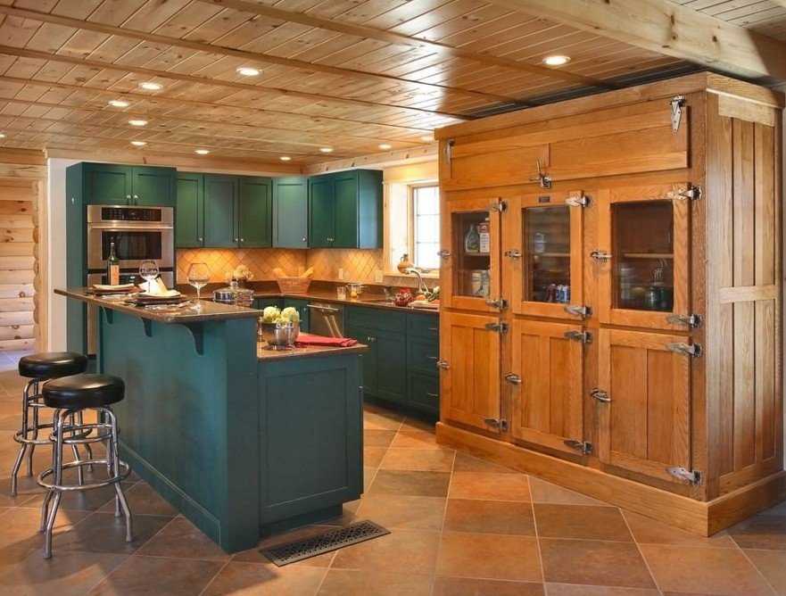Иногда фасады шкафчиков просто вскрывают лаком, сохраняя при этом естественную текстуру материала. Дверцы секций могут быть украшены резьбой, цветными узорами или стеклянными вставками, через которые будет видна красивая посуда, соответствующая направлению. Обеденный стол нужно поставить в центре комнаты, а вокруг него разместить табуреты или стулья.