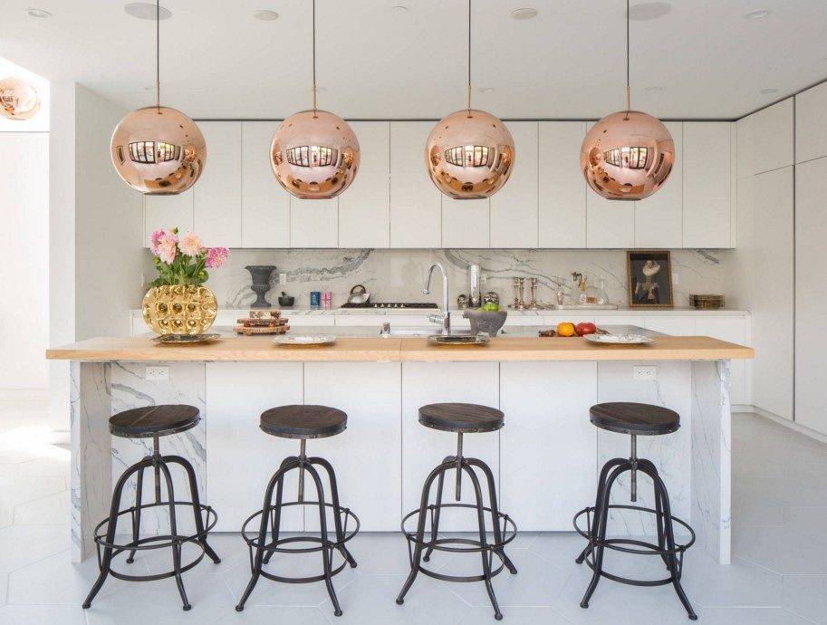 - Расположение в центре. Последний вариант кажется особенно удачным, но он подойдет только для кухни с достаточно большой площадью. К тому же такую стойку можно совместить с основным столом, сделав ступеньку (две столешницы на разных уровнях).