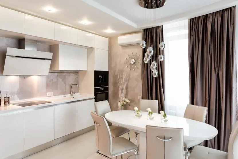 | Освещение над каждой зоной более удобно | Только центральное освещение. В кухне обязательно должна быть подсветка рабочей зоны, хотя бы потому, что свет от люстры вы загородите собой во время приготовления пищи или мытья посуды. |