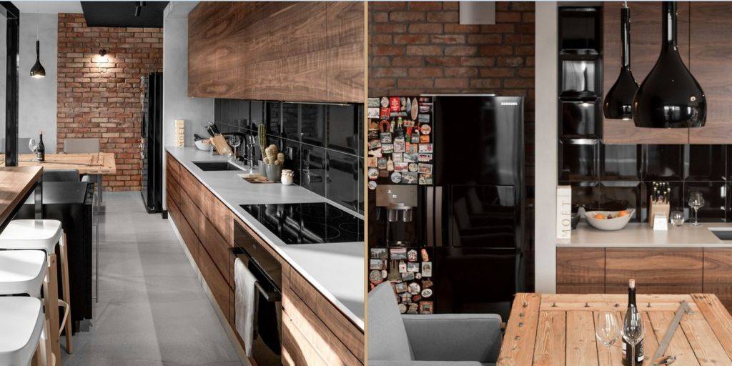 Индустриальный стиль отличается использованием довольно темных цветов, которые также будут работать на кухне. Вы получите комнату, вдохновленную лофтами, если будете использовать красный кирпич. Черная мебель с матовыми фасадами тоже подойдет. Кухня из кирпича и дерева — это решение для просторного интерьера, но его также можно разместить в немного меньшем пространстве.