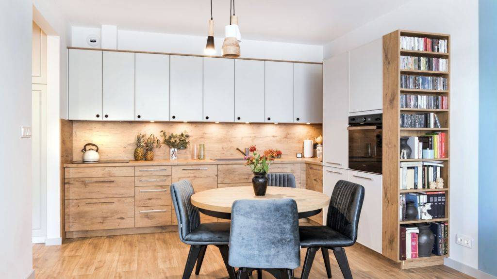 - в маленькой кухне стулья и стол расставляются по прямым линиям или же, как буква «Г»;