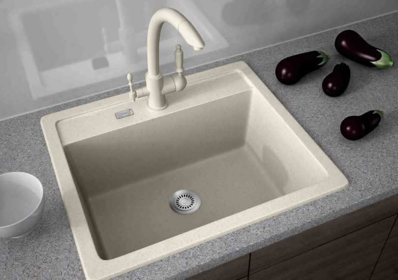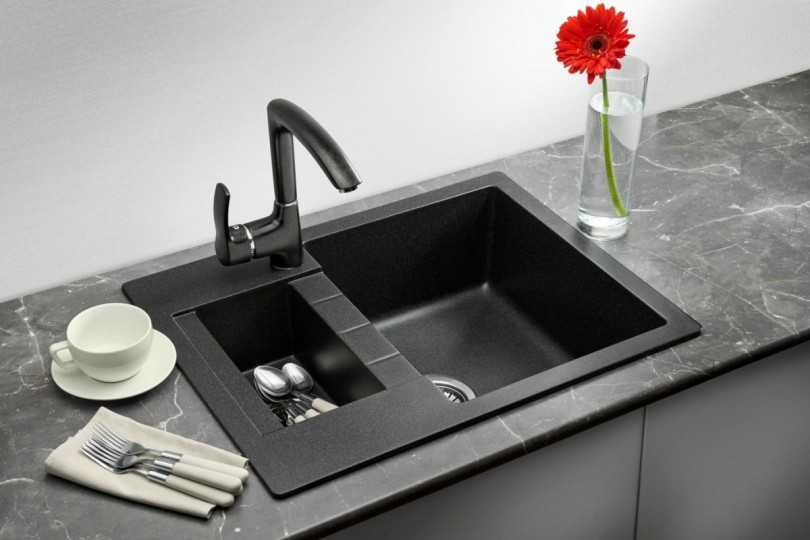 - Для функциональной кухни лучше всего выбирать глубокий прибор: в нем можно будет мыть крупную посуду и другие габаритные предметы. Невысокий смеситель — даст минимум брызг при работе.