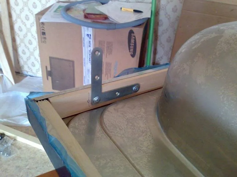 Если вы считаете, что одни кронштейны не надежные, дополнительно зафиксировать мойку можно мебельными уголками и деревянными брусками. Деревянные бруски укладываются в короб мойки, а металлические уголки крепятся по всему периметру к брускам.