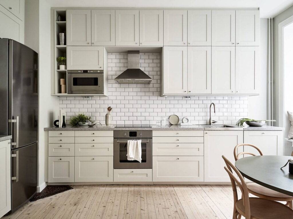 Пример кухни икеа, отражающий всю суть шведского дизайна. Лаконичная, но с изюминкой в виде простых широких рамок по контуру.
