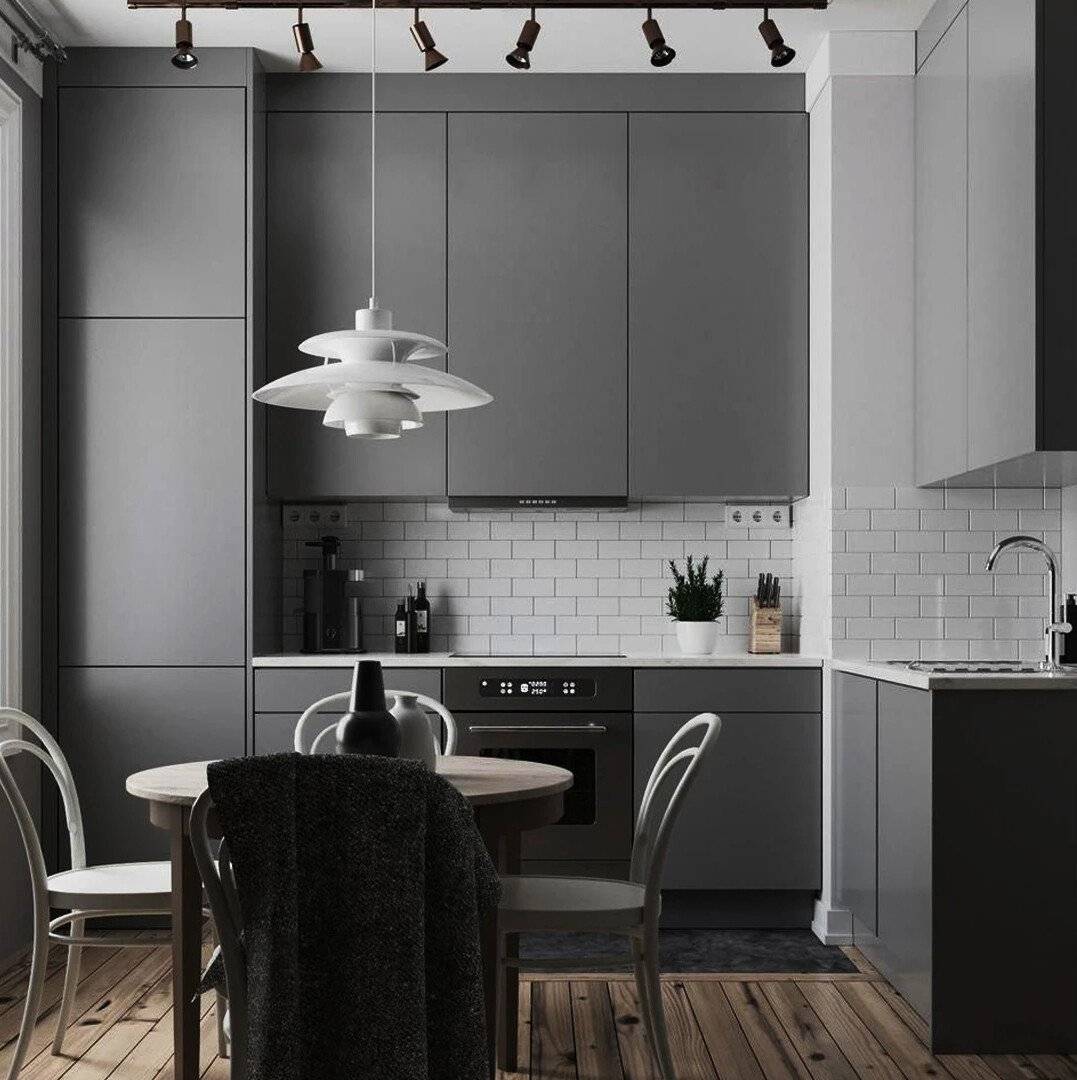 выбрать серый цвет. Фото кухонного гарнитура для маленькой кухни прямой