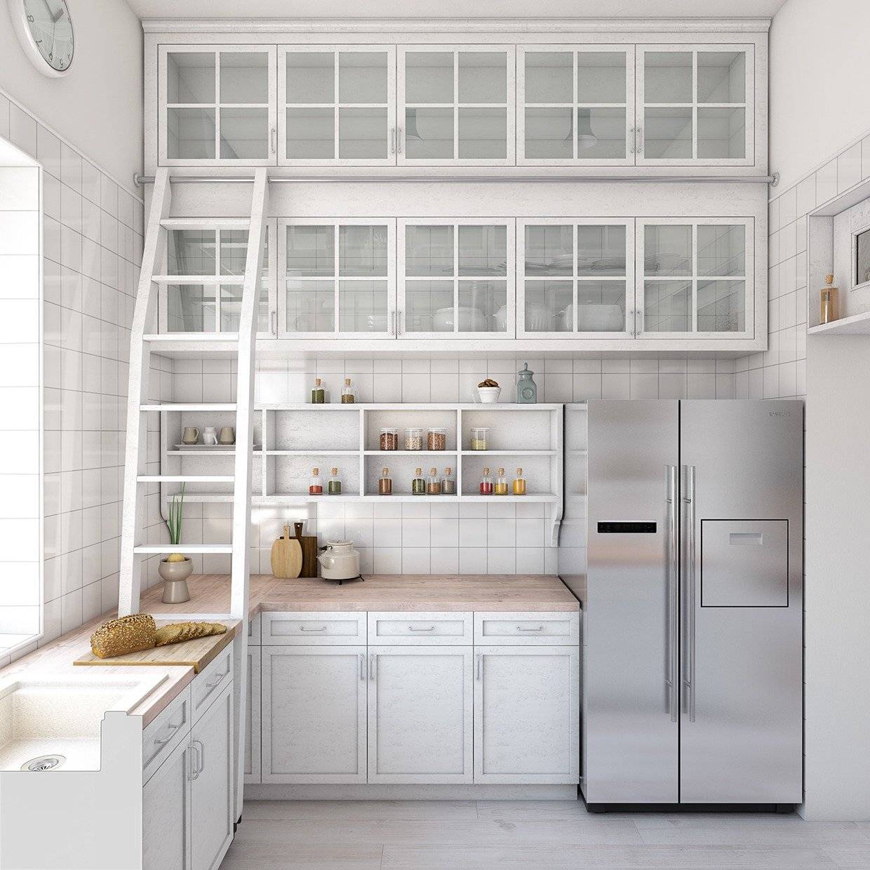 - Выбирайте верхние шкафы нестандартных размеров. Для экономии пространства их глубина может быть меньше обычной, но высота увеличена до потолка. Так потолок визуально будет казаться выше, а к полезному пространству кухонного гарнитура добавятся дополнительные места для хранения. С точки зрения ухода за мебелью шкафы до потолка – самый практичный вариант – нет поверхностей для скопления пыли и грязи.